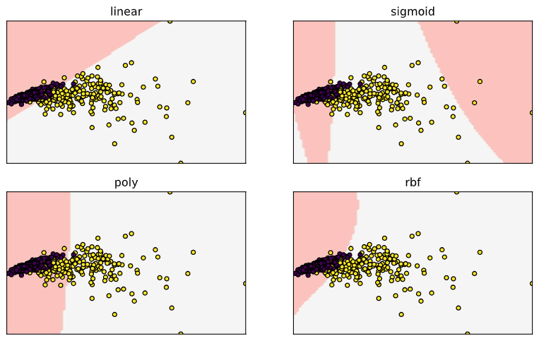 Foram avaliadas quatro variantes do SVM, cada uma utilizando um kernel diferente: linear, sigmoid, polynomial (poly) e rbf.